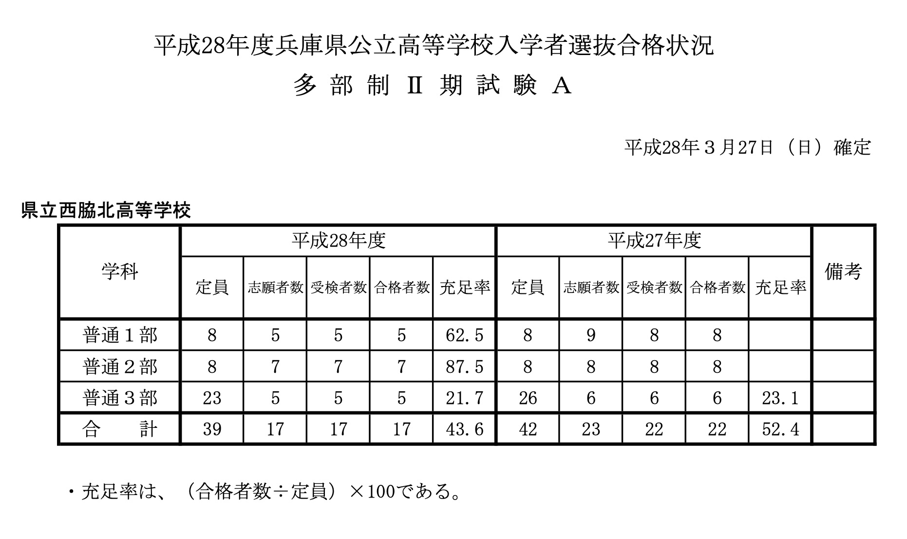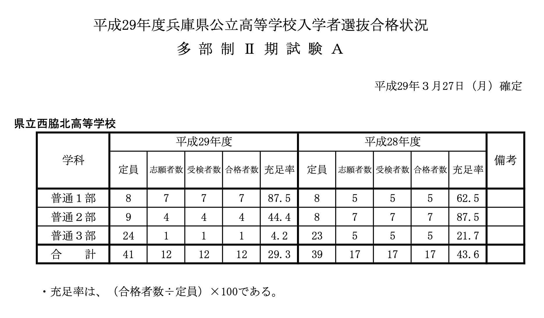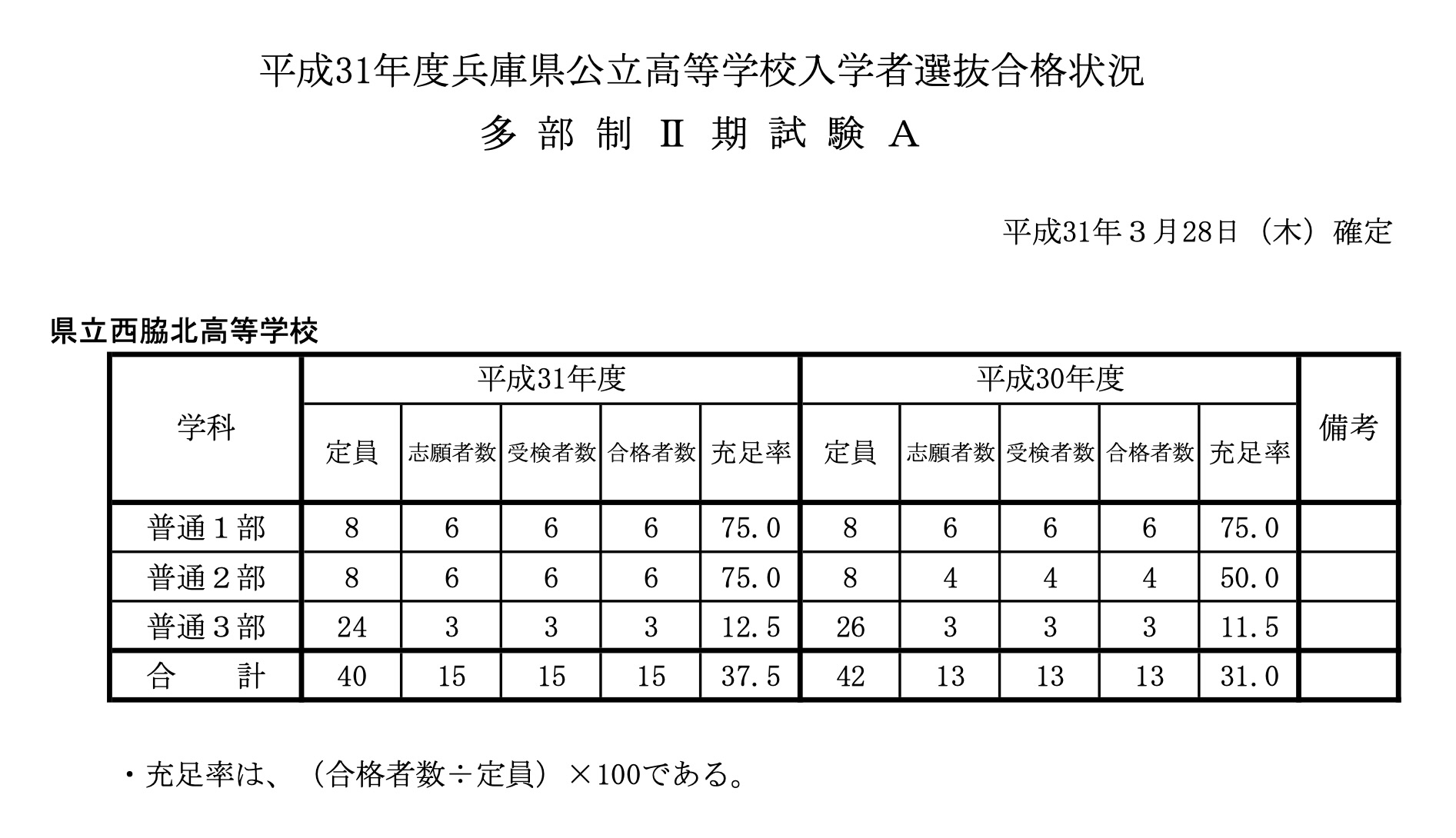 ・兵庫県立西脇北高等学校(多部制普通科)の定員割れ状況を調べた。【3年で卒業できる定時制「3修制」】