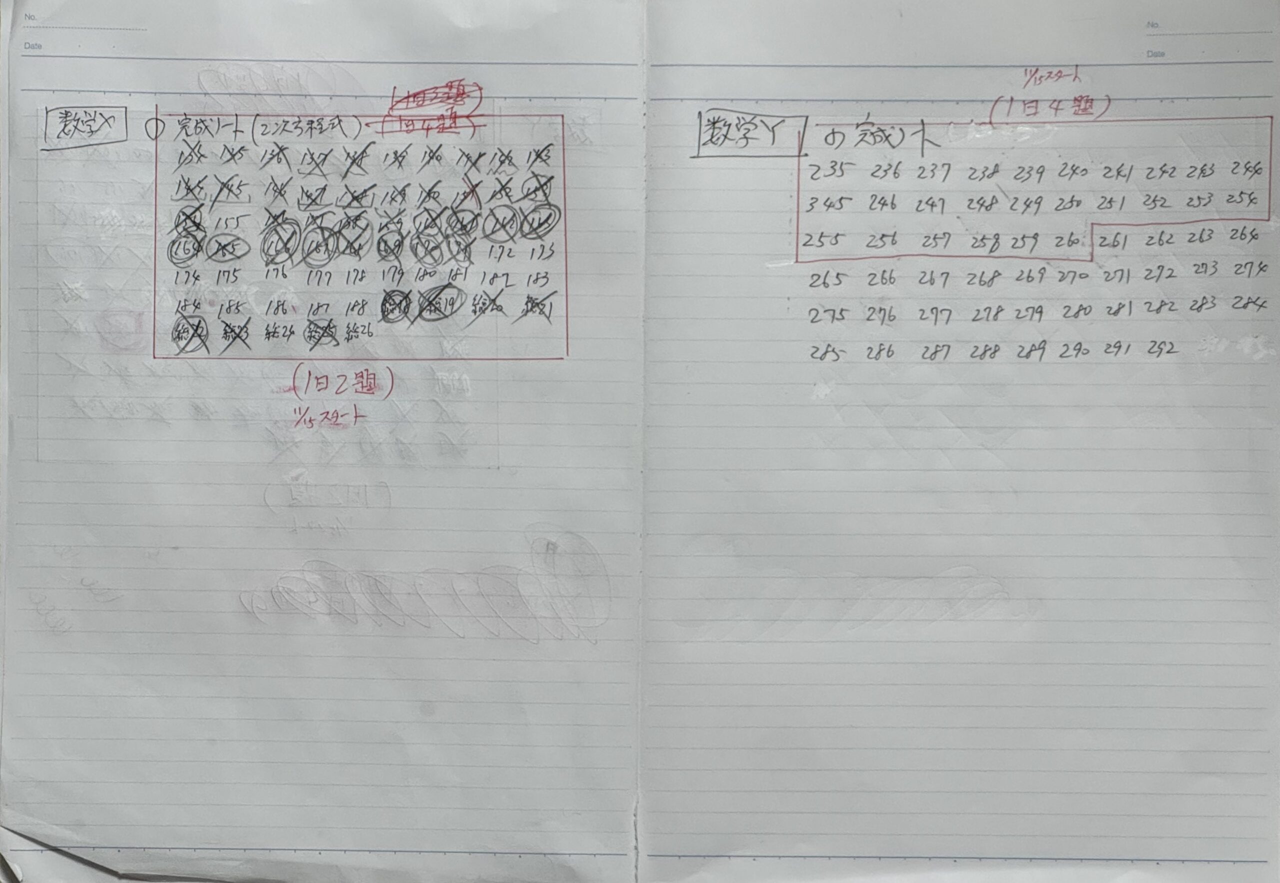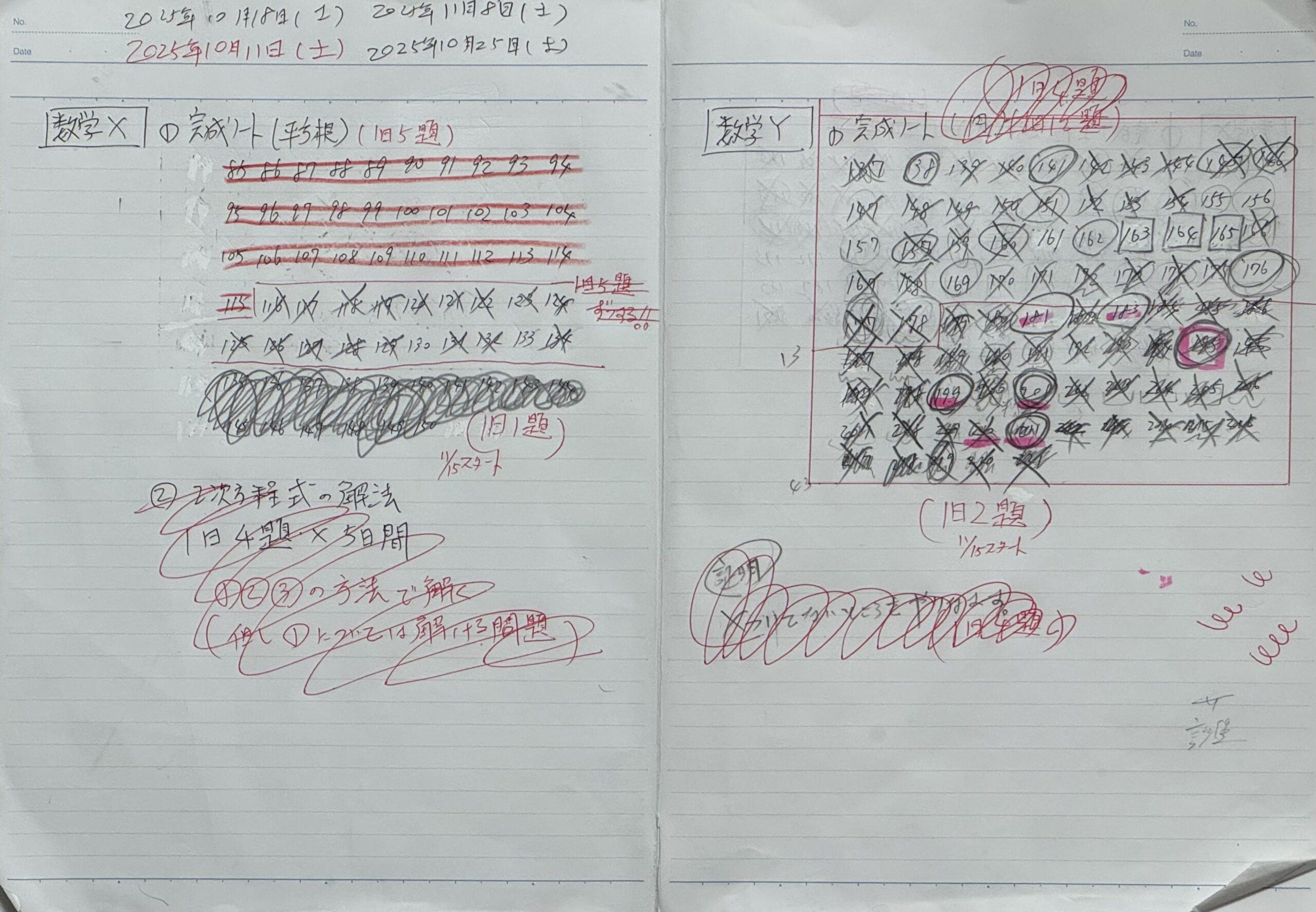期末考査範囲として195題を見込んでおります。この内,試験10日前にして136題を仕上げております。以後,試験まで1日あたり9題から8題解けば11月24日には全て仕上がる予定です。カンペキです!,予定外の実力考査対策を差し込んだので現時点でこのような状況で着地しております。今後も計画を進めます。