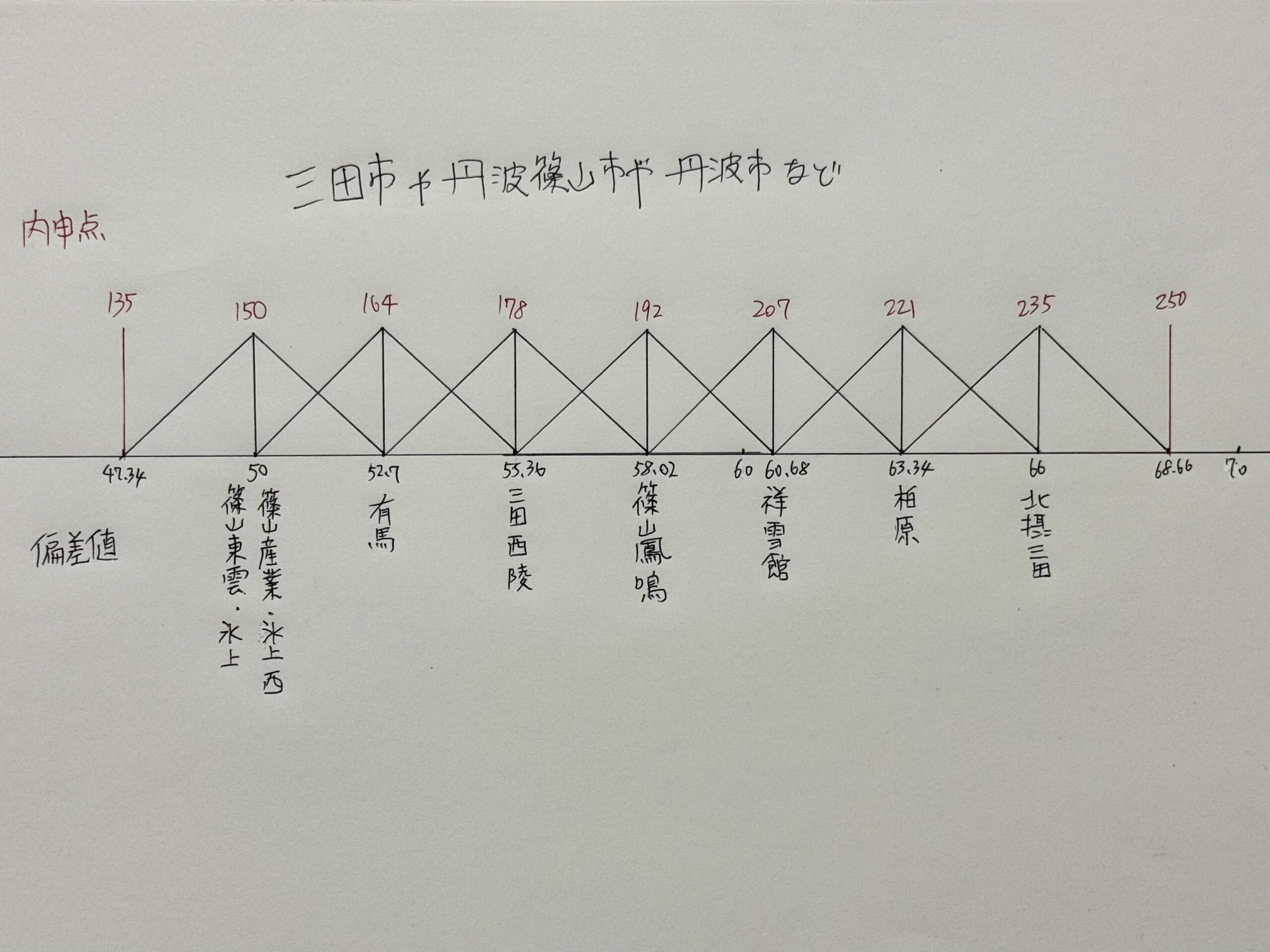 こちらの画像は受験塾家庭教師で起こした「偏差値」と「内申点」です。これを基本としてご本人様の学力と志望校との距離を導き,そのうえで入試当日に確保しなければならない点数を導き出しています。