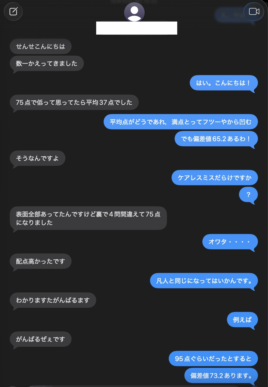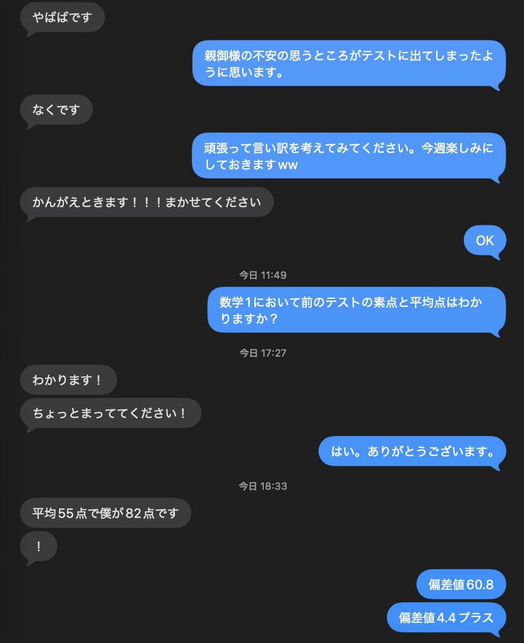 良い会話。偏差値70が見えてたけどな。次は満点とろう!【兵庫県の私立中高一貫校生】