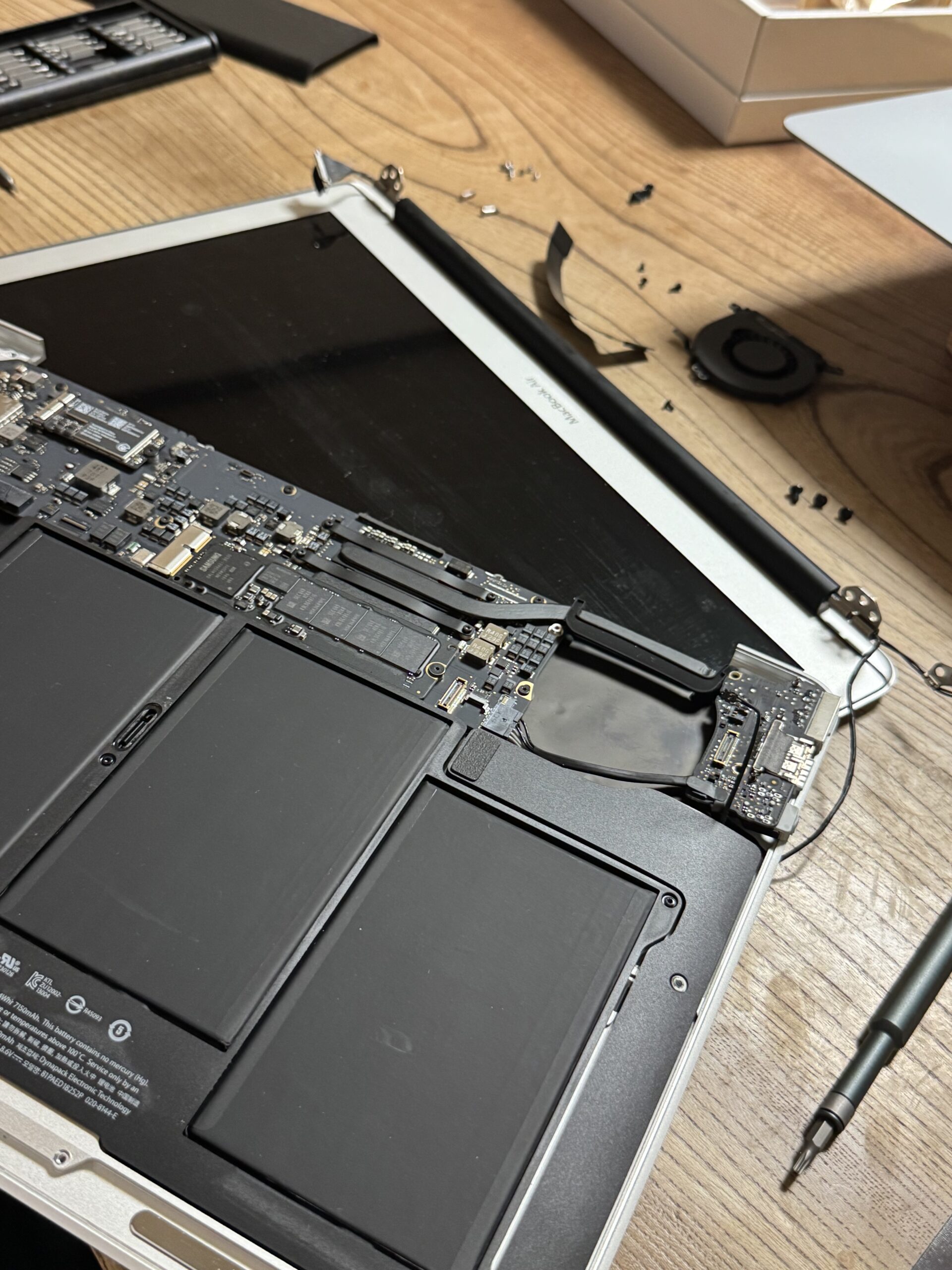 無事に部品を取り替えることもでき組み上げることもでき動作確認すること数分!,バーンという音と共にアップルのロゴマークがでました。電源が入ったらこっちのもんです。後はOSをバージョンアップしたりソフトウェアを更新したり不具合も調整したり設定作業を進め,無事に作業も完了し返却させて頂きました。